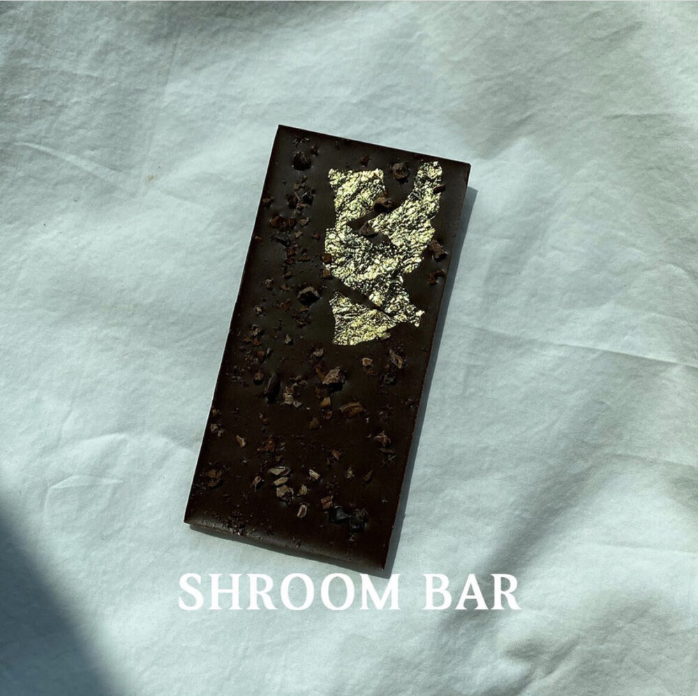 The Shroom Bar — Shiitake and organic Sajor Caju mushrooms blended with coffee beans and cacao nibs are the perfect match for the strong cacao body of Chumphon cacao beans. A dark and earthy bar with notes of ripe grapes and red berries, topped with edible 24k gold.