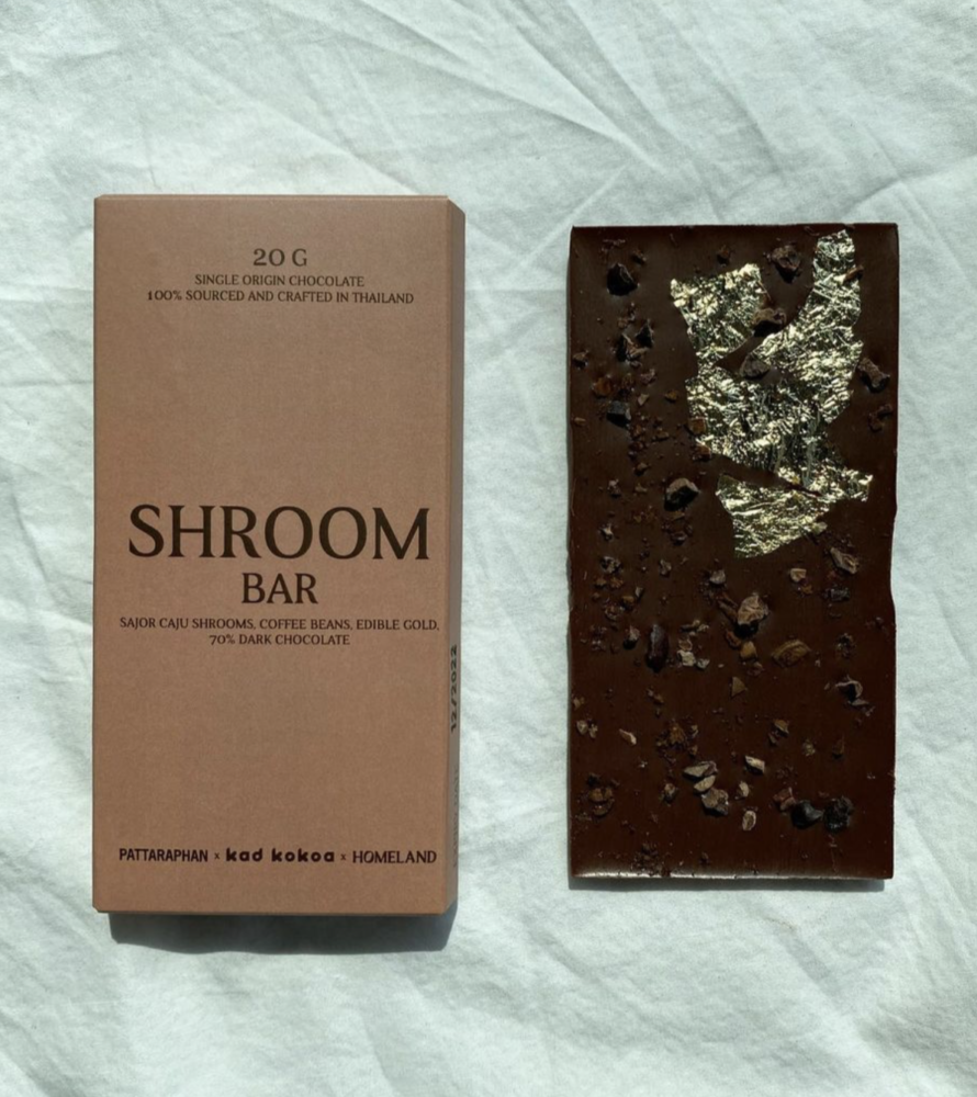 Chumphon Cacao Beans, Organic Sugar, Organic Sajor Caju Mushrooms, Shiitake Mushrooms, Cocoa Butter, Coffee Beans, Cacao Nibs, 24k Gold